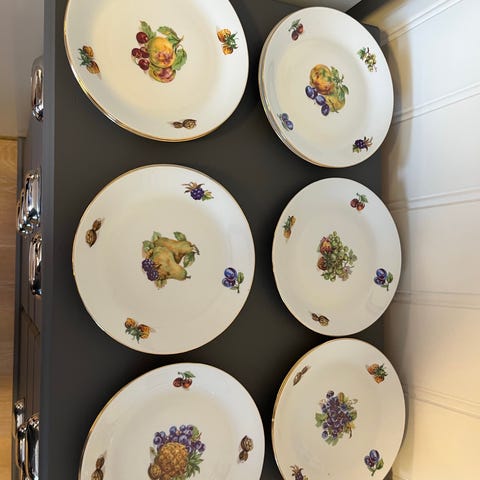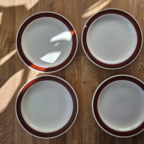Fire vintage middagstallerkener som kommer fra Hotell Astoria på Hamar.