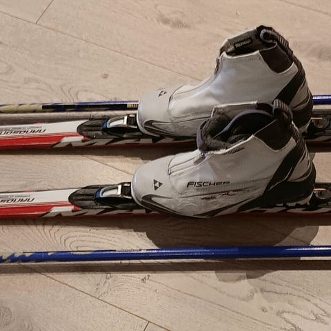 2 par alpinski med støvler, 3 par langrennski, 2 par skøyter og 2 par staver til langrenn selges