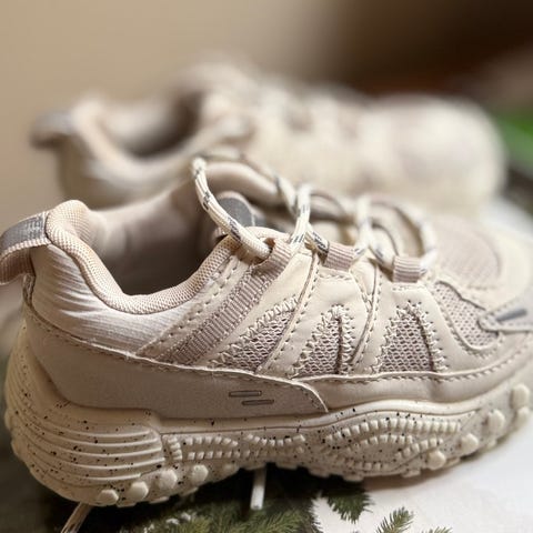 Zara barnesko for gutt i størrelse 23. Skoene har en kombinasjon av materialer i beige og brune toner med blå detaljer. De har borrelås og snøring for justerbar passform. Sålene har godt mønster for grep og stabilitet.