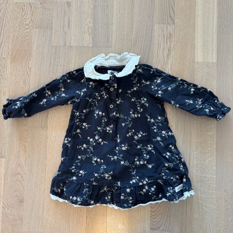 Grå bomullskjole fra Newbie i størrelse 62. Laget av bomull med blomstermønster og dekorativ krage. Passer for barn i alderen 2-4 måneder.