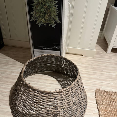 Juletrefotskjuler i grå rotting kjøpt på Hageland. Topp diameter 38 cm, bunn 57 cm og høyde 28. Kun brukt en jul.