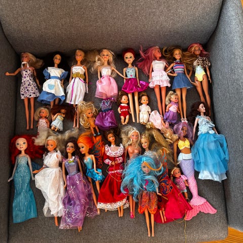 Flere Barbie dukker med ulike klær og tilbehør inkludert kjoler, shorts og diverse tilbehør som hårbørste. Dukker i forskjellige hudtoner og hårfarger. Passer som leketøy for barn.
