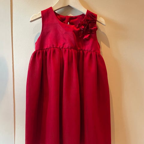 Lindex jentedrakt i størrelse 104, laget av rødt satinmateriale med teksturert rosedesign. Kjolen har knappelukking bak og er egnet for barn.