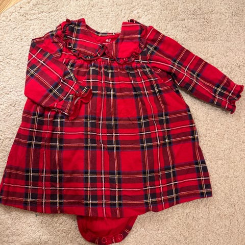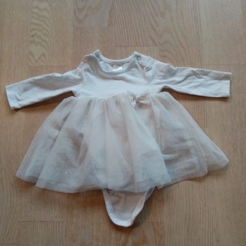 Kjole i størrelse 62 fra H&M. Lys beige farge, laget av bomull. Kjolen har lange ermer og et mønster i strikket stoff på overdelen og nederst på skjørtet. Lukking med knapp bak på nakken.