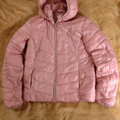 Rosa, glatt, boble-bomberjakke med avtagbar grå bommulshette i str 170 fra Kappahl, kr 100