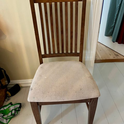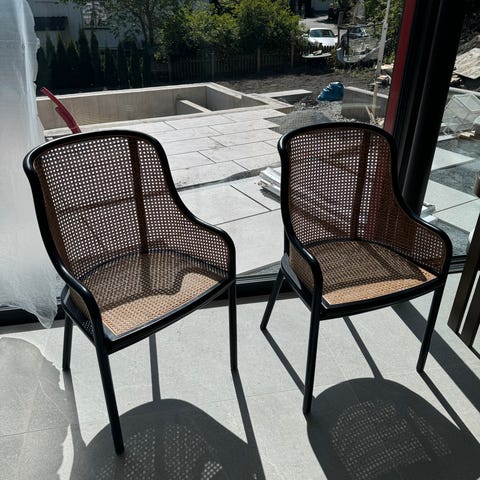 Selger to like stoler. De er malt i en sortgrå farge. Stoffet er fra Jab design, og har nagler rundt. Ny stopping.