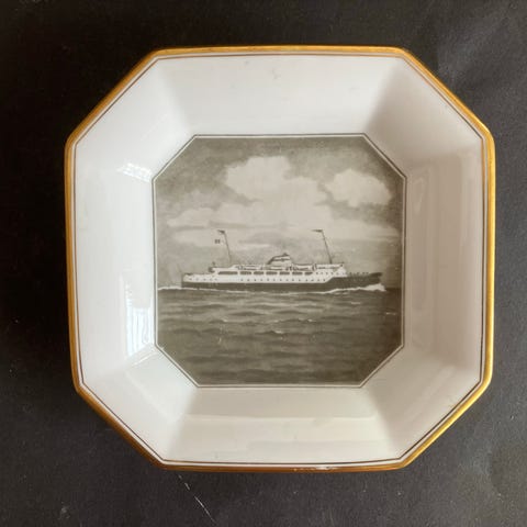 Conrad Langaard askebeger i porselen, med motiv av vikingskip, datert 1993. Ca. 19,5 x 15,5 x 3,5 cm. I fin stand.