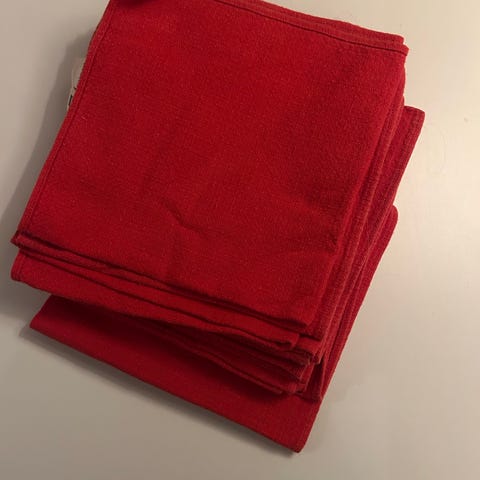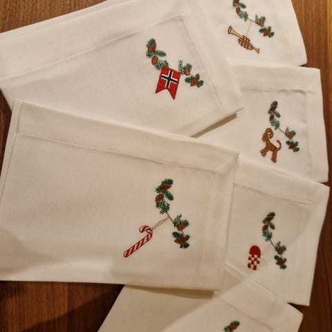 12 ubrukte røde tøyservietter i 100 % bomull, design Hans-Henrik Hansen of Copenhagen, selges. Passer perfekt til et julepyntet festbord.
