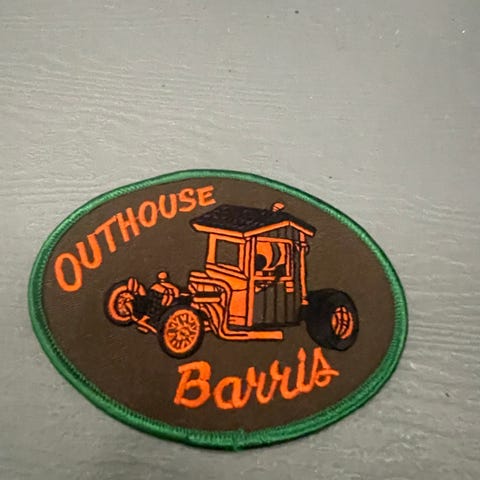 Outhouse Barris broderi patch med motiv av en vintage bil. Oval form med grønn kant og oransje tekst og detaljer.