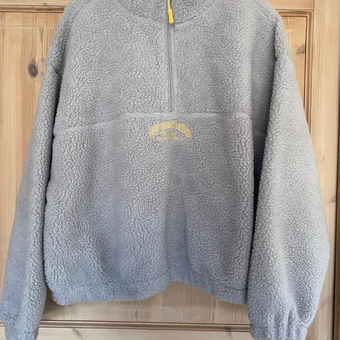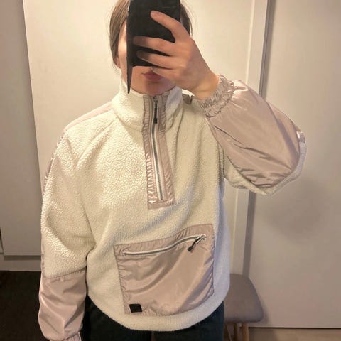 Pull&Bear Genser i beige fleece, størrelse M for dame. Genseren har et mykt fleece-materiale og et design med fargestriper på ermene og brystet.
