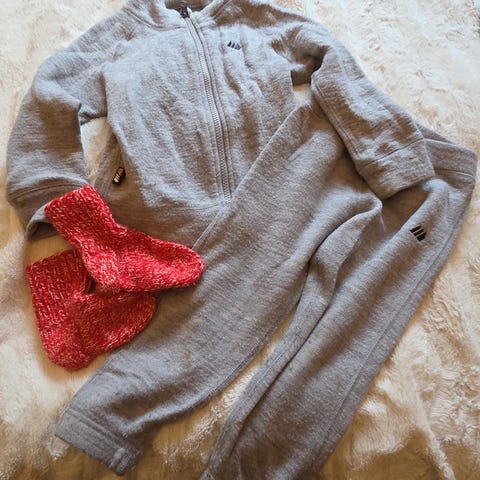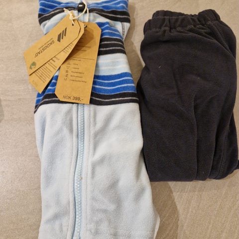 Skogstad ullsett for barn i størrelse 92, farge blå. Genseren er laget av ull. En liten hull i buksen, se bildet