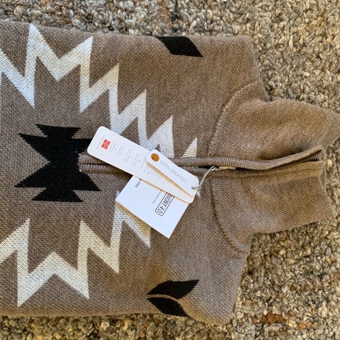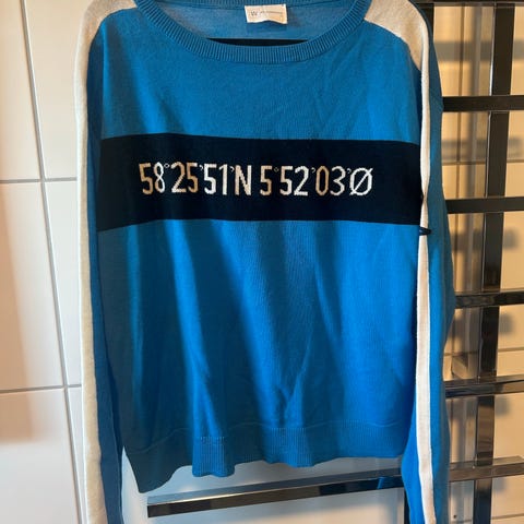 We Norwegians genser i merinoull for dame, størrelse L. Genseren har svart farge med mønster i hvitt og grått, og har glidelås i halsen. Materialet er merinoull, som gir varme og komfort.