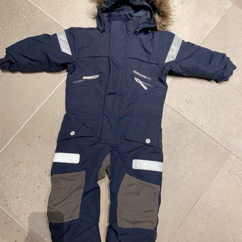 Didriksons barneheldress i størrelse 110, farge mørkeblå, laget av polyester. Dressen er designet for unisex bruk og er 100 % vanntett.