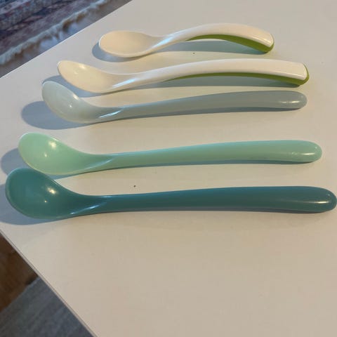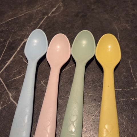 Bambino babyskjeer laget i plast i flere farger. Egnet for barn, designet for enkel bruk og rengjøring. 14 stk selges samlet for 100 kr. Tupperware skjeen med oppbevaringsboks selges for 50 k