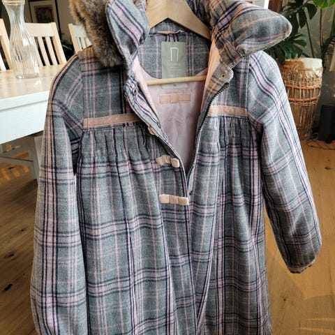 Fôret hette med fuskepels. Glidelåslukning og tre trykknapper øverst. Lommer. Mange fine rosa detaljer. Rutete innerfôr.