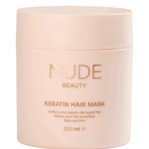 Nude Beauty Kreatin Hair Oil med en volum på 75 ml. Produktet er designet for hårpleie og kommer i en rosa flaske med pumpe.