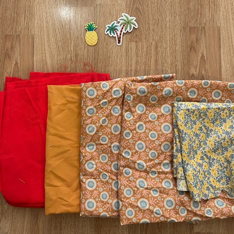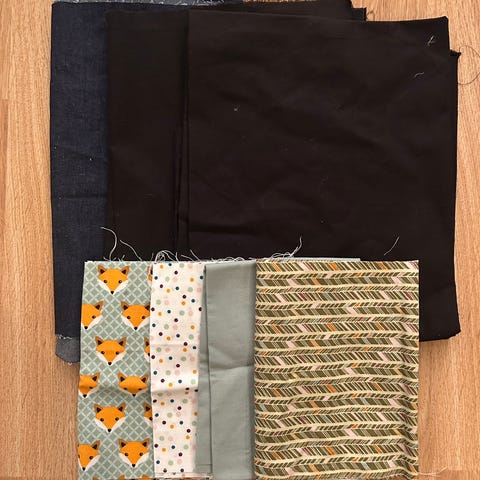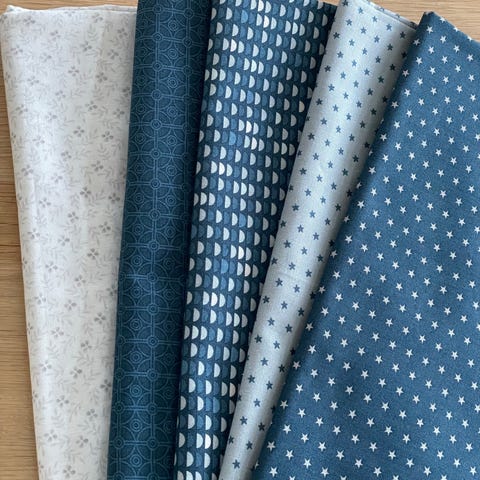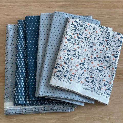 Stoffpakke bestående av bomullsstoffer med ulike mønstre og farger. Pakken inkluderer stoff med prikkmønster, blomsterprint, geometriske former og ensfarget stoff. Mengden av hver stoffstykke står under hvert bilde.