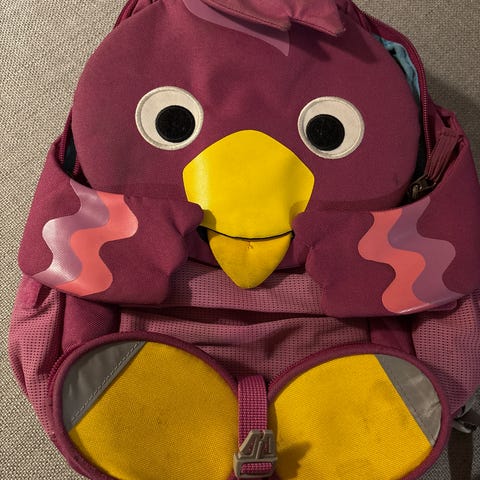 Morsom barnehagesekk med rom til flasker begge sider og glidlåslommer forran i «beina».