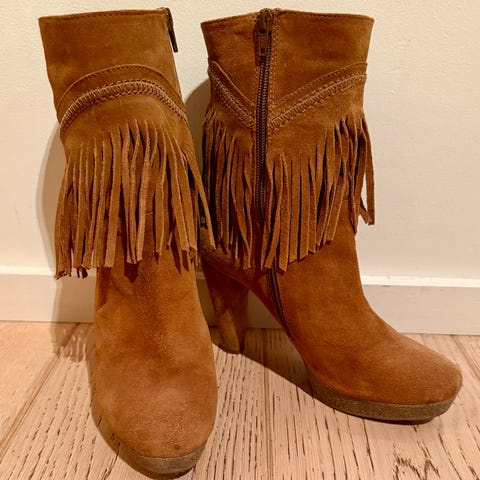 H&M Hæler i størrelse 39 med rødt materiale. Produktet har høye hæler og ankelstropp. Brukt kun 1 gang. Passer fint til jul :)