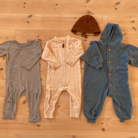 Selger tre ullbodyer, ullbukse og lue i str. 68-74