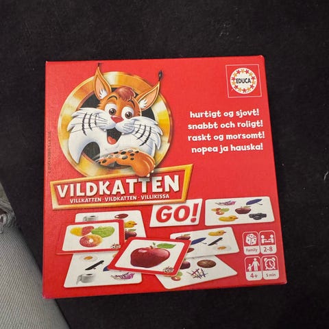 Vildkatten Go! er et brettspill som inkluderer 30 kort med ulike bilder. Spillet er designet for 2-6 spillere og passer for barn fra 6 år og oppover. Det er et raskt og morsomt spill som utfordrer observasjonsevnen.