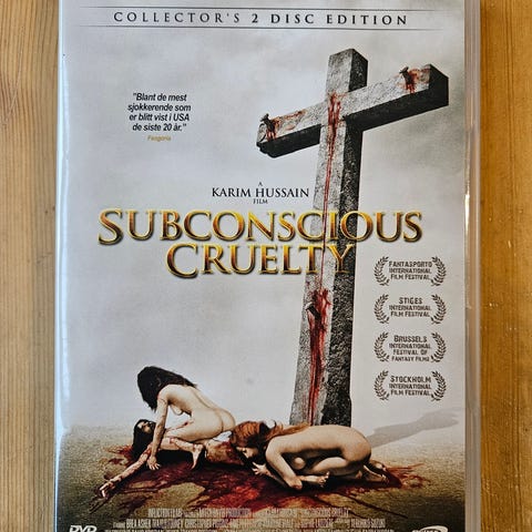 Subconscious Cruelty DVD med original cover. Inneholder filmen Subconscious Cruelty, kjent for sin kontroversielle og kunstneriske stil. Produktet er i DVD-format.