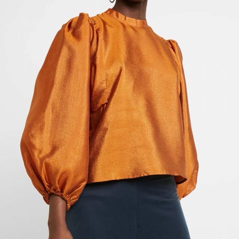 Langermet bluse i nydelig dyp blå farge og i stoff av acetat og polyester med silkepreg (blankt, skinnende og silkeglatt). Relativt tykt stoff. Størrelse S, men oppleves romslig i størrelsen (dog uten stretch).