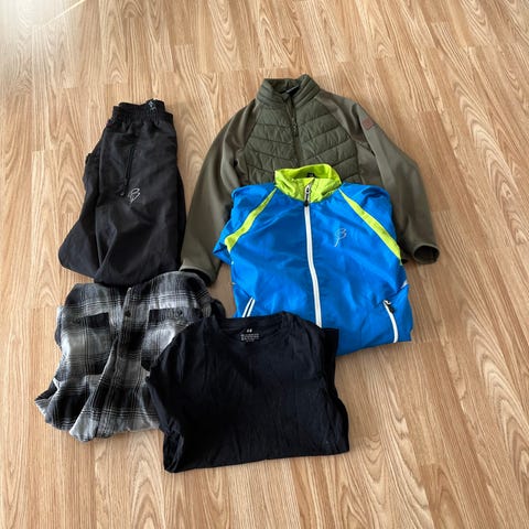 3 nederst: blå hellyhansen str 122, grønn stormberg str 128 og foret reflex regnjakke med nøtt str 128. Selges billig! 300 kr for alle