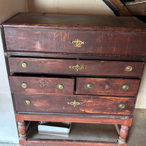 Antikk skrivebord i mørkt tre med flere oppbevaringsrom og hengslet lokk. Bordet har en klassisk design med buede ben og en ekstra hylle under bordflaten. Passer for oppbevaring og som skrivebord i hjem eller kontor.