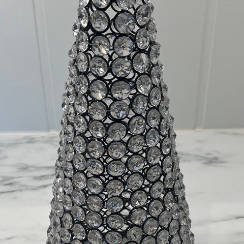 Sett med tre krystallkuler i ulik størrelse brukt som dekorasjon. Kuglene er klare og reflekterer lys i ulike farger. Kan brukes som bordpynt eller i vinduskarm.