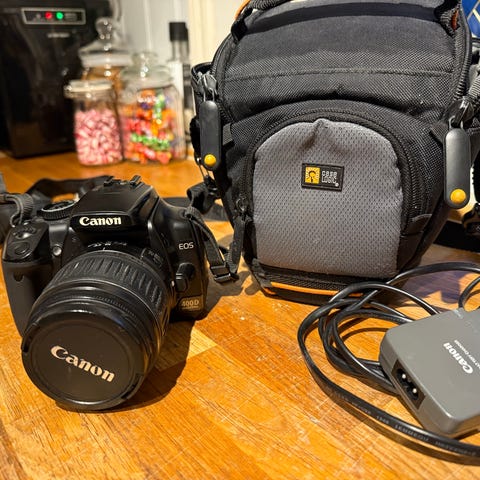 Canon EOS speilreflekskamera med innebygd blits og LCD-skjerm. Kameraet leveres med flere SD-kort i ulike størrelser (1 GB, 2 GB, 8 GB, 16 GB). Passer til fotografering i ulike situasjoner og gir mulighet for manuell og automatisk innstilling av eksponering og fokus. Linsen er en SIGMA DC. 18-200MM de selges for sånn. 1500kr brukt