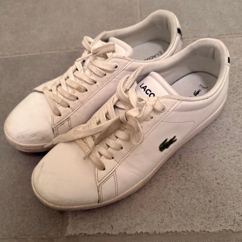 Lacoste sko, hvite skinnsko, Lacoste sneakers, brukte Lacoste, skinn sneakers, Lacoste herre, Lacoste dame, Carnaby, Powercourt, Lerond, Court-Master, tøysko, fritidssko, hvite sko, semsket skinn, low-top trainers, leather trainers, casual shoes, sportssko, tennis sko, joggesko, C72, Oslo, 0.66 kg, pent brukt, pre-owned, second hand, vintage trainers, tennis shoes, Lacoste Crocodile