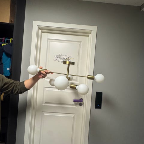 Taklampe med tre justerbare spotter i børstet metall. Lampen har et rundt feste og er egnet for montering i tak. Spottene kan justeres for å rette lys der det er ønskelig.
