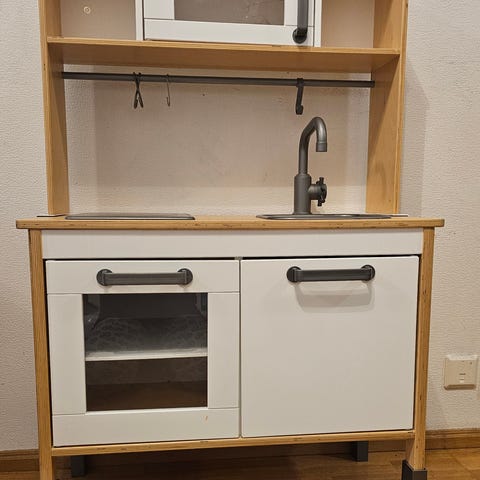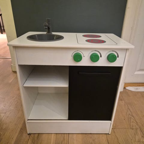 Lekekjøkken med en pose med mat og full sett med plast servise