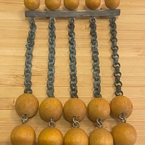 Unikt anheng i sølv og tre - stemplet 925 ved festet til kjedet.