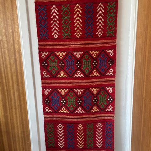 Håndlaget teppe med et flerfarget mønster bestående av rødt, gult, svart og hvitt. Teppe har frynser i den ene enden og et geometrisk design. Egnet som gulvteppe eller dekorativt element.