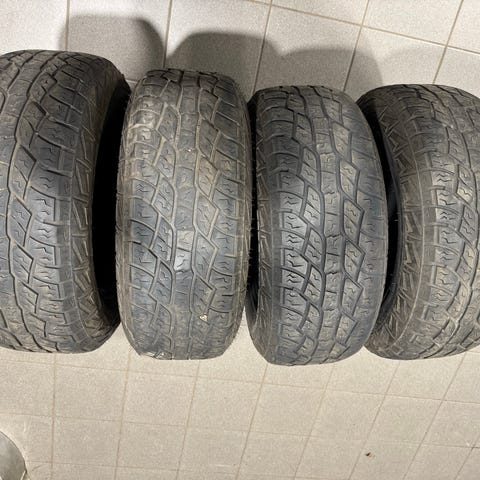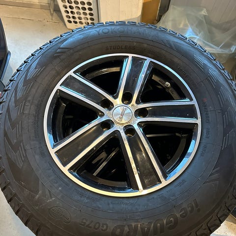 Dekkene har god mønsterdybde (se bilde) og er i god stand. Felgene er brukte og har noe kosmetisk oksidasjon, men er ellers solide.