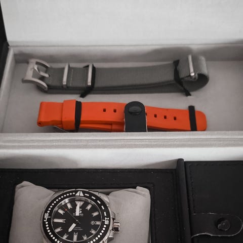 Pent brukt klokke. Lenke er ny og helt ubrukt, ikke "kuttet". Selges med nato reim, original eske og garantikort etc. som avbildet. Hentes på Gjøvik eller sendes for kjøpers regning.