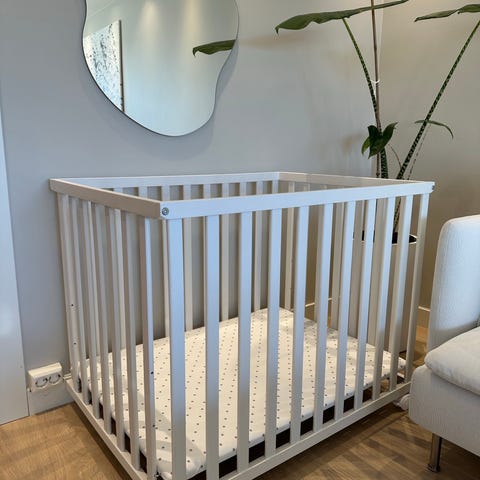 Selger en sammenleggbar XXL lekegrind i grå/hvit. Den er trygg, stabil og superpraktisk! Passer både som lekeområde og ballbinge.