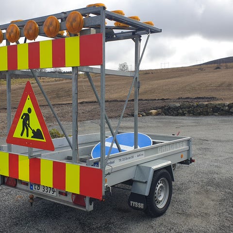 Tilhenger/sperrevogn/varslingsvogn utstyrt med varselskilt og refleksmarkering for økt synlighet. Laget i metall med solid konstruksjon.