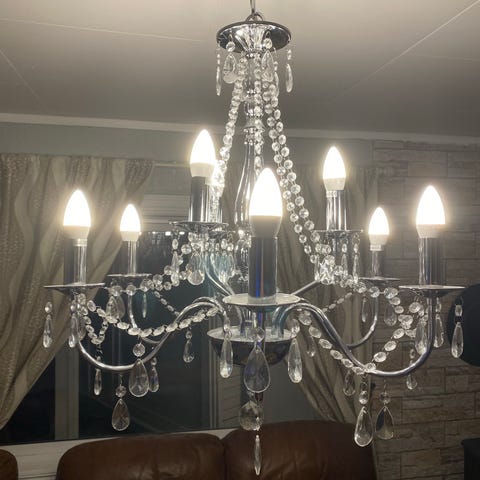 5 armet Lysekrone i matt sort med prismer, mener den er fra Lisbeth Dahl. H: 90 cm ( uten kjetting) fra topp til kula. D: 50 cm
