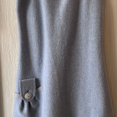Mediun grå farge med kremfarget trim og blomster. Ingen vaskelapp men det er stor del ull. Str XS/S vil jeg si. Noen nupper med lett å fjerne om noen har tid.