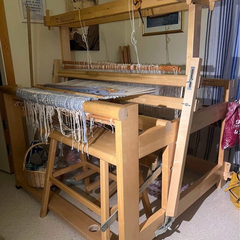 Lite brukt de senere år. Fastskrudd krakk. Vevbredde 1 meter. Komplett, demontert og lagret inne. Må hentes.
