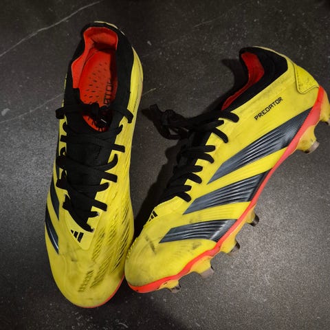 Adidas Predator fotballsko i størrelse 40. Skoene har gul farge med svarte og røde detaljer. Designet for bruk på fotballbanen med knotter på yttersålen for godt grep.