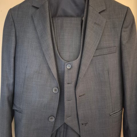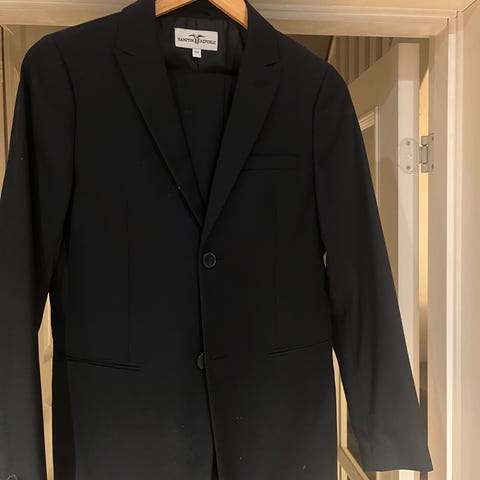 Det er et fint snitt på dressen og alt passer en smal gutt på ca 12-13 år.