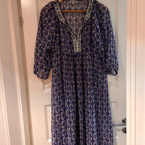 Fin kjole I brunt og hvitt.Knyttebelte i livet,passer til hverdag og fest.Korte ermer.