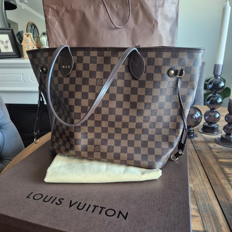 Louis Vuitton Neverfull veske med karakteristisk rutemønster i brune toner og rødt interiør. Vesken har to skulderstropper, en romslig åpning med knappelukking og det folger med en organizer i rødt for å holde god form på vesken. Organizern har flere innvendige lommer for organisering. Materialet er slitesterkt og designet for daglig bruk.
