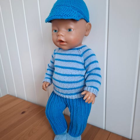 Baby Born dukke klær sett bestående av flere plagg i forskjellige farger og materialer. Settene inkluderer gensere, bukser, ponchoer og tilbehør som luer og vesker. Plaggene er håndstrikket og designet for å passe Baby Born dukker.