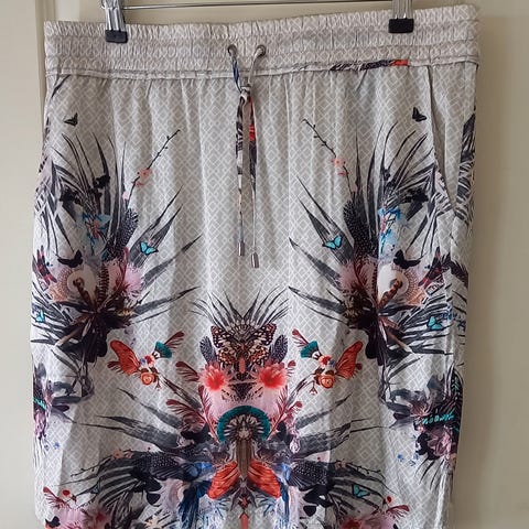 DeaKudebal - skjørt i svart-hvit mønster. 66% mulberry silke, 26% viskose, 8% elastane. To lommer og elastisk midje. Str S. Ingen bruksmerker.