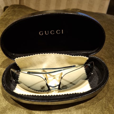 Gucci dame solbriller med svart innfatning og mørke glass. Solbrillene leveres med etui for oppbevaring. Jeg tar Vipps perfekt for julegave 🧑 🎄